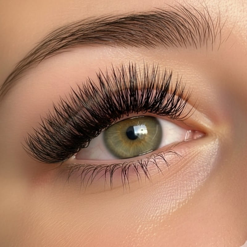 Russian Volume extensions use 2–6 ultra-fine lashes fanned and applied to each natural lash, creating a dense, voluminous look with striking intensity.